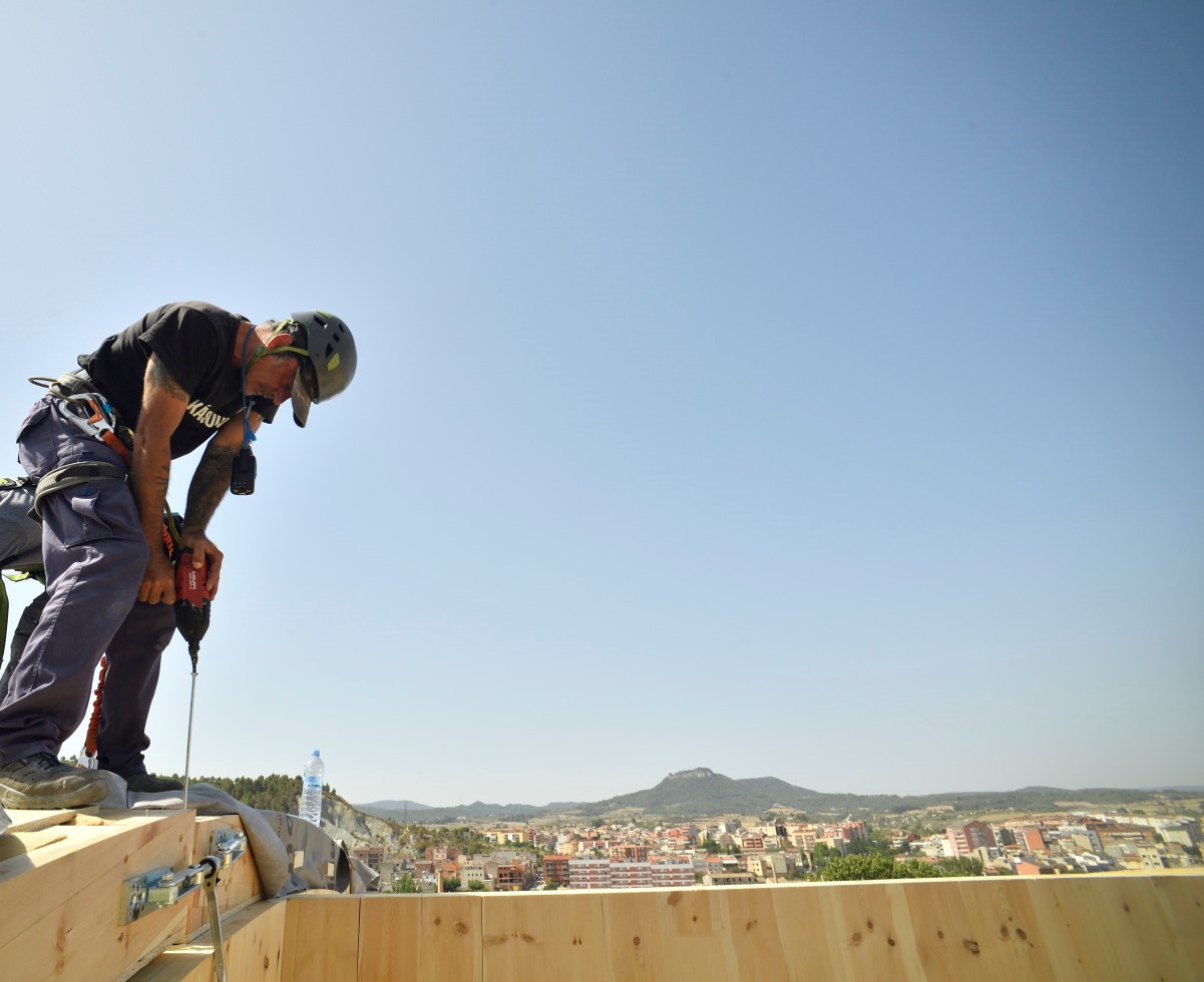 - Fusta CLT: La Base de la Renovació: La fusta contralaminada (CLT) ha estat l’ànima d’aquesta renovació. Hem utilitzat panells CLT d’alta qualitat per mantenir l’essència històrica de l’edifici mentre se li atorga una vida nova. Aquest material ofereix una combinació única de resistència i versatilitat, cosa que permet conservar l’estabilitat i el caràcter de l’estructura original.